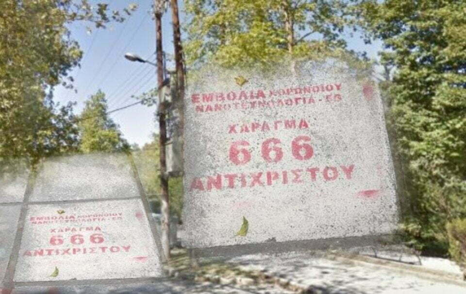Σε πλακάκια πεζοδρομίου με τη μορφή σφραγίδας για να μην φύγει το σύνθημα, γράφουν :  « ΕΜΒΟΛΙΑ ΚΟΡΩΝΟΪΟΥ, ΝΑΝΟΤΕΧΝΟΛΟΓΙΑ 5G,  ΧΑΡΑΓΜΑ 666 ΑΝΤΙΧΡΙΣΤΟΥ»