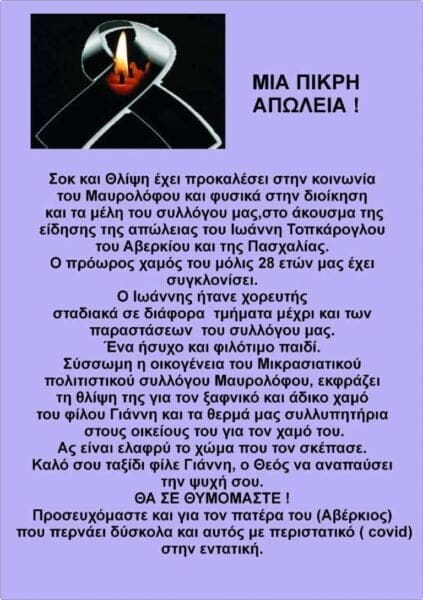 Εν τω μεταξύ ο Μικρασιατικός Πολιτιστικός Σύλλογος Μαυρολόφου, αποχαιρετά το μέλος του, Γιάννη.