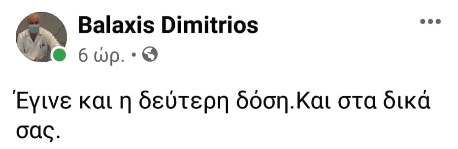 Χωρίς κατηγορίαΣέρρες: Την δεύτερη δόση του εμβολίου έκανε ο Δ. Μπαλαξής Από: Γρηγόρης Θωματίκος29 Ιανουαρίου 202129 Ιανουαρίου 2021 ΚοινοποίησηΤην δεύτερη δόση του εμβολίου κατά του Covid19 έκανε ο Διευθυντής της ιατρικής υπηρεσίας του Νοσοκομείου Σερρών, Δημήτρης Μπαλαξής.Δείτε τι έγραψε στον λογαριασμό του στο facebook: