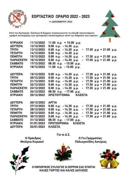 Αναλυτικά το προτεινόμενο από τον Εμπορικό Σύλλογο Σερρών ωράριο λειτουργίας των εμπορικών καταστημάτων για την εορταστική περίοδο των Χριστουγέννων 2022: