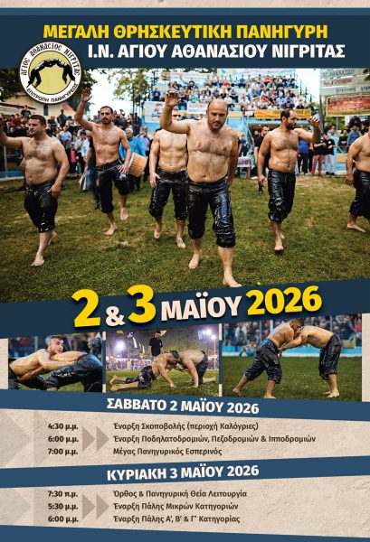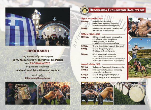 Από την Επιτροπή Πανηγύρεως Αγίου Αθανασίου Νιγρίτας ανακοινώθηκε το πρόγραμμα  της Μεγάλης Θρησκευτικής και Εμπορικής Πανήγυρης που θα λάβουν χώρα την Πέμπτη 30 Απρίλίου, το Σάββατο 2 Μαΐου και την Κυριακή 3 Μαΐου του 2026.