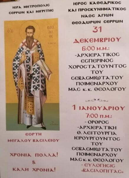 -Σαββατο 1 Ιανουαρίου 2022 στις 7.00 π.μ.: Όρθρος και Θεία Λειτουργία ιερουργούντος του Μητροπολίτη Σερρών & Νιγρίτας κ.κ.Θεολόγου.