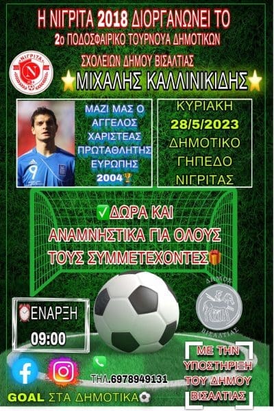 Η Ομάδα ποδοσφαίρου ΝΙΓΡΙΤΑ 2018 σε συνεργασία με τον δήμο Βισαλτίας και τα δημοτικά σχολεία του δήμου, διοργανώνουν το 2ο αθλητικό τουρνουά «GOAL ΣΤΑ ΔΗΜΟΤΙΚΑ 5Χ5» την Κυριακή 28 Μαΐου 2023, από τις 9:00 το πρωί, στο Γήπεδο Νιγρίτας!