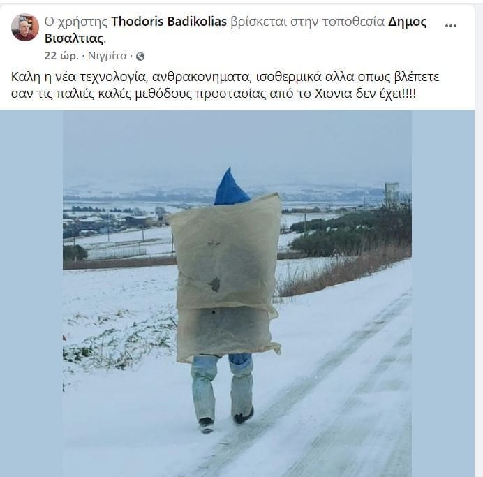 Έναν ασυνήθιστο τρόπο βρήκε πολίτης του δήμου Βισαλτίας, για να προστατευτεί από το χιόνι και το κρύο.