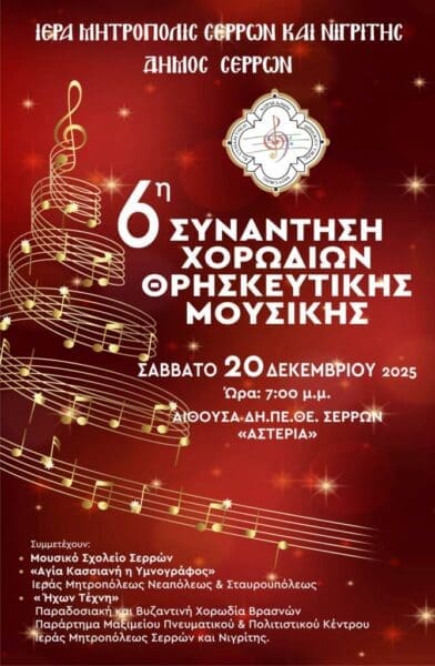 Η Ιερά Μητρόπολη Σερρών και Νιγρίτης και ο Δήμος Σερρών διοργανώνουν το Σάββατο 20 Δεκεμβρίου, την 6η Συνάντηση Χορωδιών Θρησκευτικής Μουσικής, στην κεντρική σκηνή του Δημοτικού Θεάτρου «Αστέρια», στις 7 το βράδυ.
