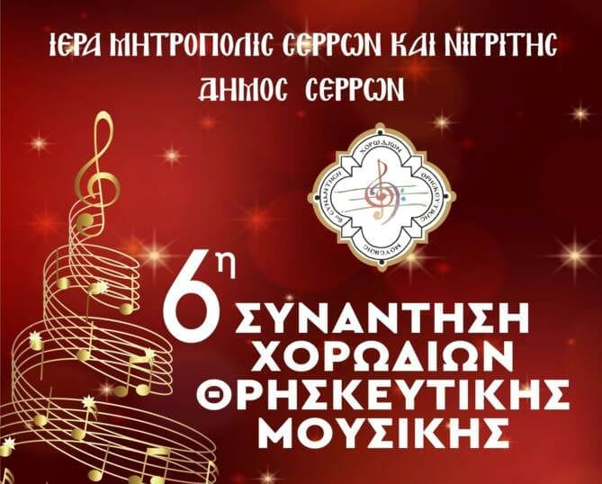 Η Ιερά Μητρόπολη Σερρών και Νιγρίτης και ο Δήμος Σερρών διοργανώνουν το Σάββατο 20 Δεκεμβρίου, την 6η Συνάντηση Χορωδιών Θρησκευτικής Μουσικής, στην κεντρική σκηνή του Δημοτικού Θεάτρου «Αστέρια», στις 7 το βράδυ.