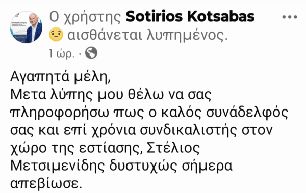 «Ο Πρόεδρος και το Διοικητικό συμβούλιο της Ένωσης Καταστημάτων Αναψυχής & Εστίασης Ν. Σερρών εκφράζουν τη βαθύτατη θλίψη τους και τα θερμά τους συλλυπητήρια για την απώλεια του συναδέλφου επαγγελματία, Στέλιου Μετσιμενίδη.