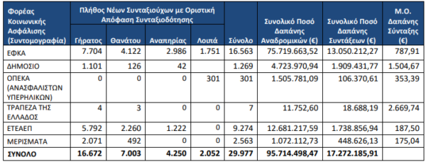 Σύμφωνα με τα στοιχεία της έκθεσης «Ήλιος» για τον Νοέμβριο 2025, η μέση κύρια σύνταξη λόγω γήρατος για τους νέους συνταξιούχους του ΕΦΚΑ που πληρώθηκαν το Νοέμβριο και προέρχονται από ταμεία του ιδιωτικού τομέα -ως επί το πλείστον ΙΚΑ και ΟΑΕΕ- διαμορφώθηκε στα 787,91 ευρώ, ενώ για τους νέους συνταξιούχους του Δημοσίου ήταν 1.504.67 ευρώ.