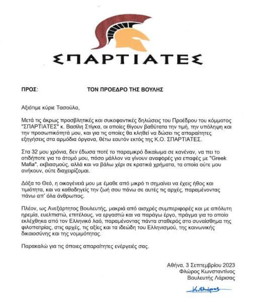 «Μετά τις άκρως προσβλητικές και συκοφαντικές δηλώσεις του Προέδρου του κόμματος “ΣΠΑΡΤΙΑΤΕΣ” κ. Βασίλη Στίγκα, οι οποίες θίγουν βαθύτατα την τιμή, την υπόληψη και την προσωπικότητά μου, και για τις οποίες θα κληθεί να δώσει τις απαραίτητες εξηγήσεις στα αρμόδια όργανα, θέτω εαυτόν εκτός της Κ.Ο. ΣΠΑΡΤΙΑΤΕΣ», αναφέρει στην επιστολή του προς τον κ. Τασούλα ο κ. Φλώρος.