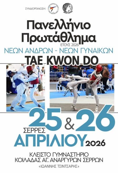 Ο Δήμος Σερρών ανακοινώνει τη διεξαγωγή του Πανελληνίου Πρωταθλήματος Ταεκβοντό (Tae Kwon Do) Νέων Ανδρών και Νέων Γυναικών, το οποίο θα πραγματοποιηθεί το Σάββατο 25 και την Κυριακή 26 Απριλίου 2026, στην πόλη των Σερρών.