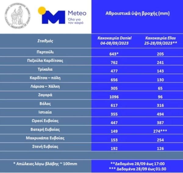 Τα ύψη βροχής που καταγράφηκαν κατά την κακοκαιρία Daniel ήταν μεγαλύτερα στη Θεσσαλία, ενώ στην Εύβοια (με εξαίρεση τους σταθμούς σε Ωρεούς και Στενή) τα ύψη βροχής της κακοκαιρίας Elias ήταν μεγαλύτερα.