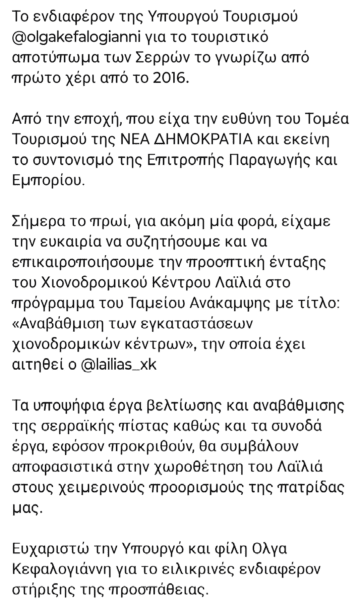 «Το ενδιαφέρον της Υπουργού Τουρισμού @olgakefalogianni για το τουριστικό αποτύπωμα των Σερρών το γνωρίζω από πρώτο χέρι από το 2016.