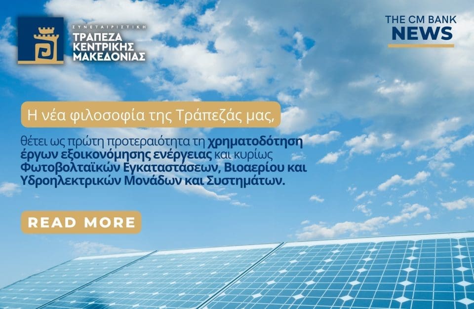 Η Συνεταιριστική Τράπεζα Κεντρικής Μακεδονίας θέτει ως πυρήνα της στρατηγικής της τη χρηματοδότηση επενδύσεων Α.Π.Ε. μικρομεσαίου χαρακτήρα, διαπιστώνοντας ότι οι βασικές αρχές του συνεταιριστικού κινήματος βρίσκουν εφαρμογή στη συλλογικότητα της παραγωγής ενέργειας.