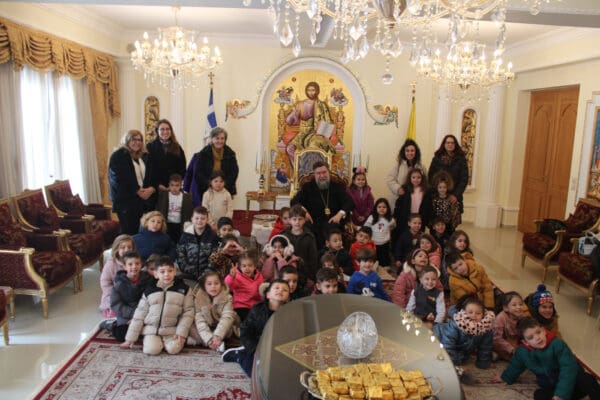 Ο Σεβασμιώτατος υποδέχθηκε τα 130 και πλέον παιδιά, συνοδευόμενα από τους δασκάλους τους και άκουσε, από τους μικρούς αγγελιοφόρους της γεννήσεως του Χριστού τα παραδοσιακά κάλαντα και άλλα χριστουγεννιάτικα τραγούδια. Ακολούθως, τους ομίλησε με απλούς λόγους, για το νόημα της μεγάλης Δεσποτικής εορτής της ενανθρωπήσεως του Κυρίου και την προσφορά του σχολείου στην ζωή του ανθρώπου.
