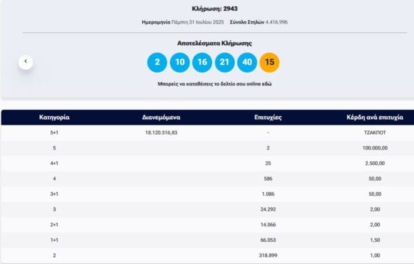 Πραγματοποιήθηκε το βράδυ της Πέμπτης 31 Ιουλίου η κλήρωση 2943 του Τζοκερ που μοιράζει στην πρώτη κατηγορία περισσότερα από 18 εκατ. ευρώ .