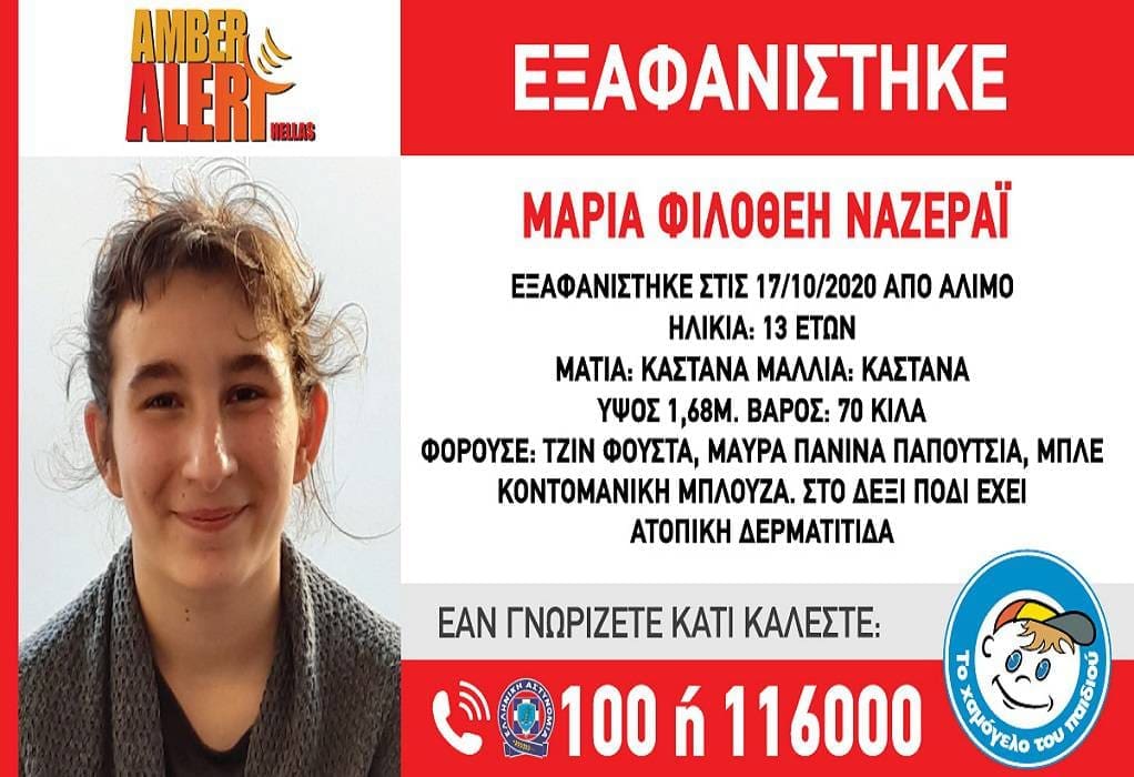 Στις 19/10/2020 βρέθηκε η Μαρία-Φιλοθέη Ναζεράϊ 13 ετών, η οποία είχε εξαφανιστεί στις 17/10/2020 από την περιοχή του Αλίμου.